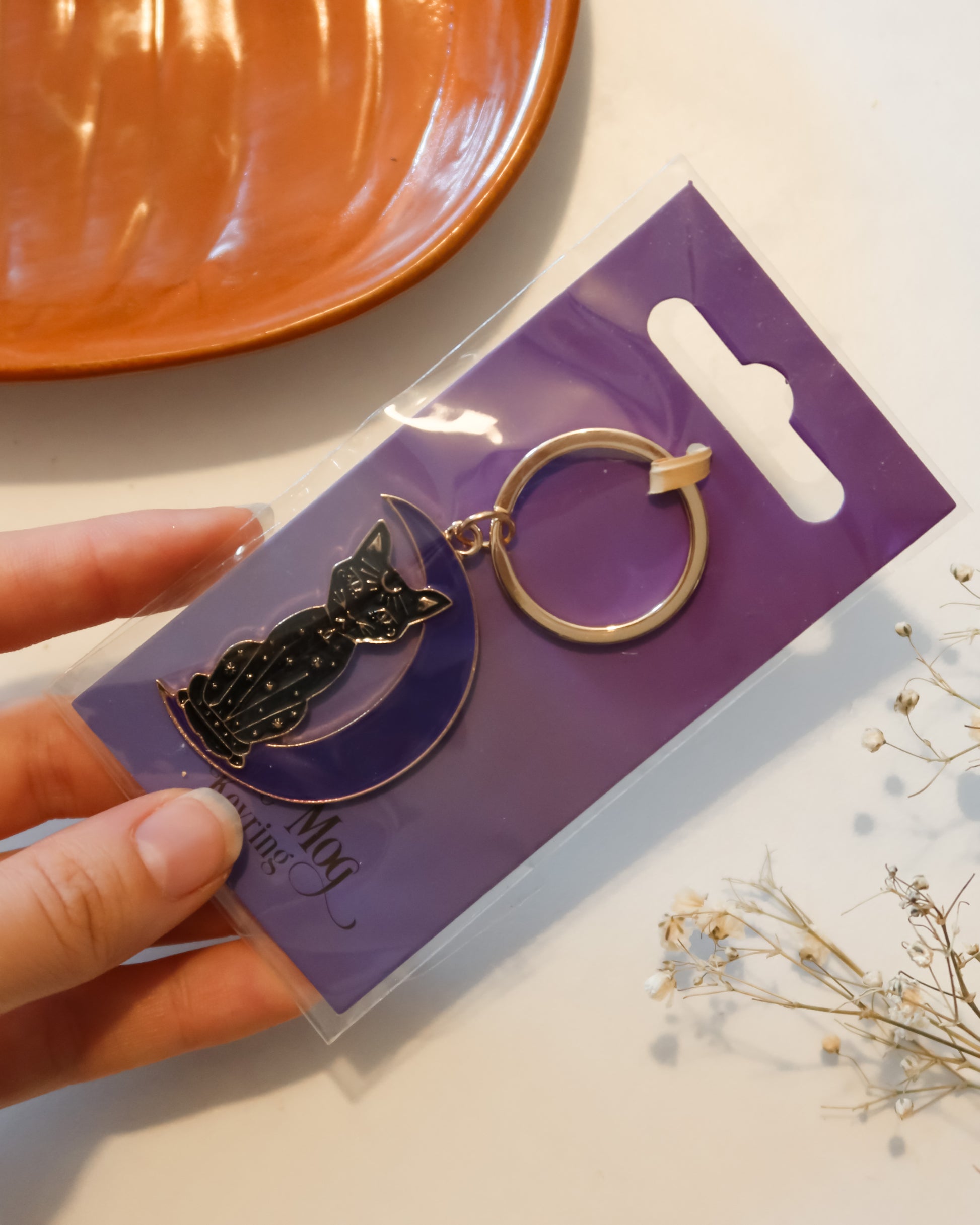 Portachiavi con ciondolo a forma di gatto e mezzaluna.